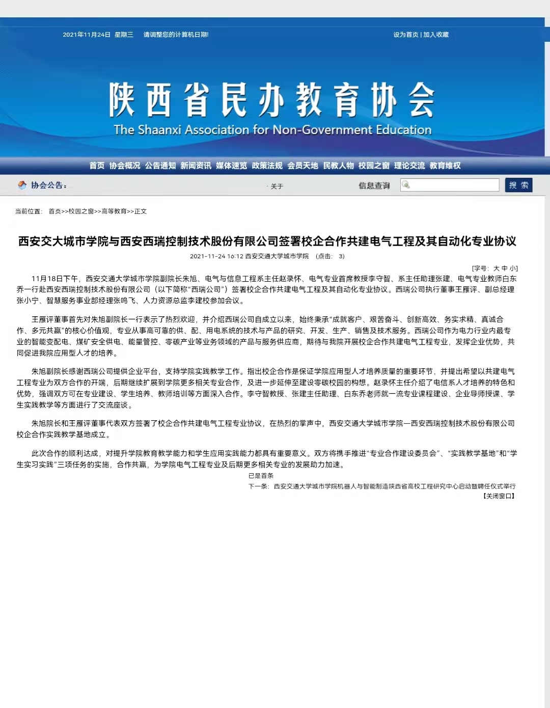 近日,陕西省民办教育协会报道了西安交大城市学院与西安西瑞控制技术股份有限公司签署校企合作共建电气工程及其自动化专业协议情况,具体链接及内容如下: