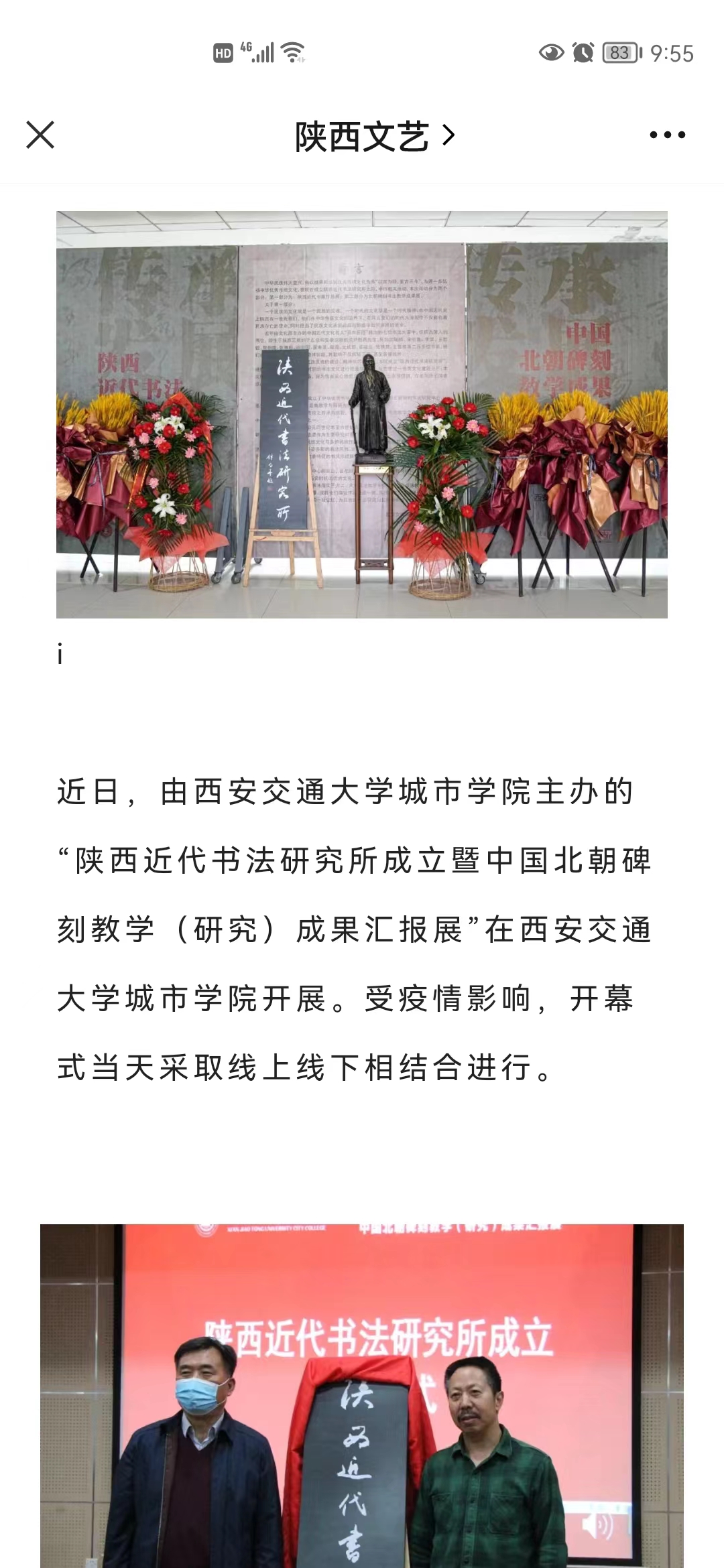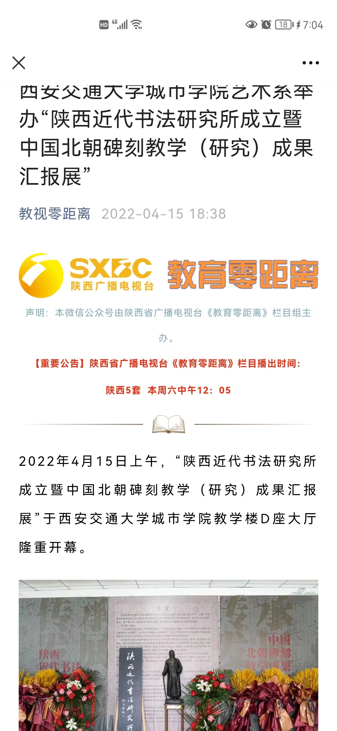 4月15日,陕西省广播电视台《教育零距离》栏目组及公共文艺频道报道了我院举办“陕西近代书法研究所成立暨中国北朝碑刻教学(研究)成果汇报展”活动。具体链接及内容如下: