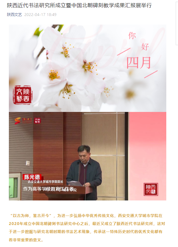 近日,陕西广播电视台公共文艺频道所属陕西文艺微信公众号报道了陕西近代书法研究所成立暨中国北朝碑刻教学成果汇报展内容,具体链接及内容如下: