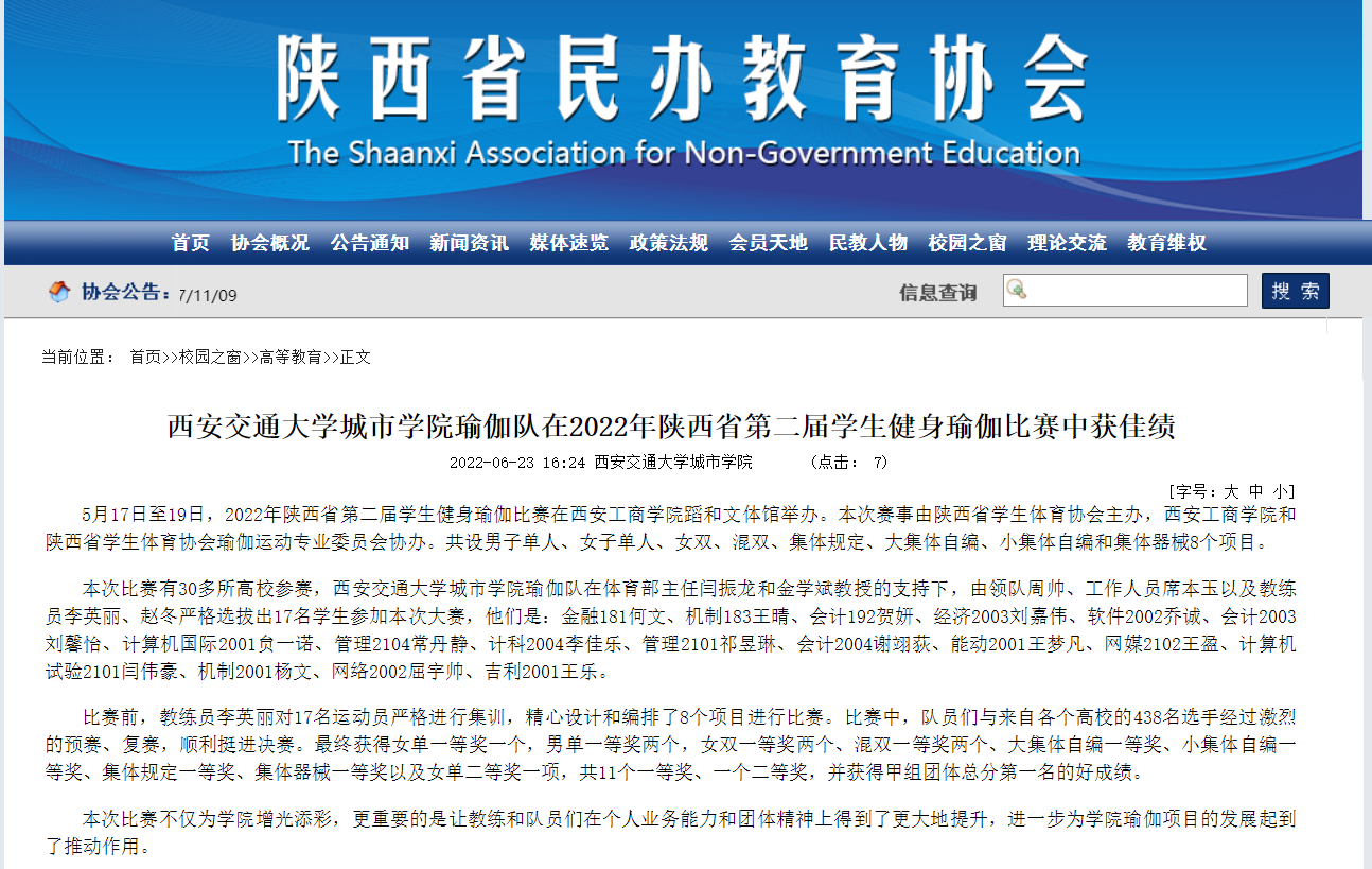 近日,陕西省民办教育协会报道了学院瑜伽队在2022年陕西省第二届学生健身瑜伽比赛中取得优异成绩。具体内容及链接如下: