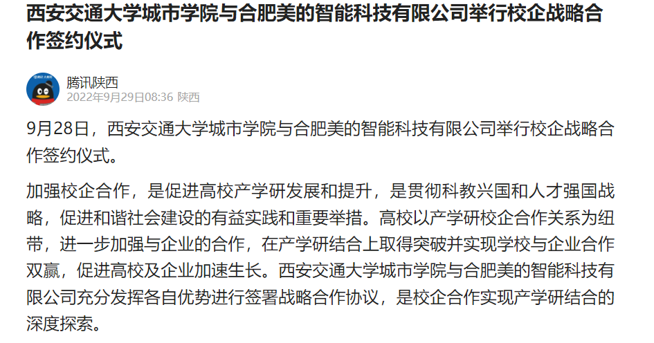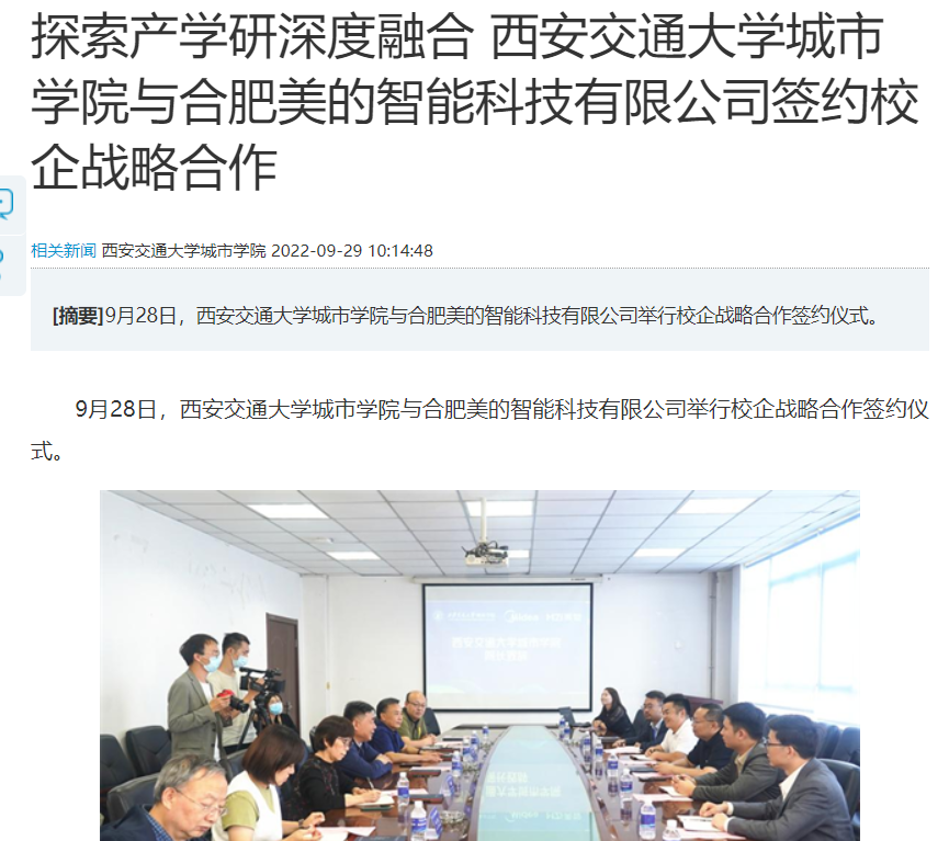 近日,央广网、西部网、华商网、腾讯陕西平台等对学院与合肥美的智能科技有限公司举行校企战略合作签约仪式进行了报道,具体链接如下: