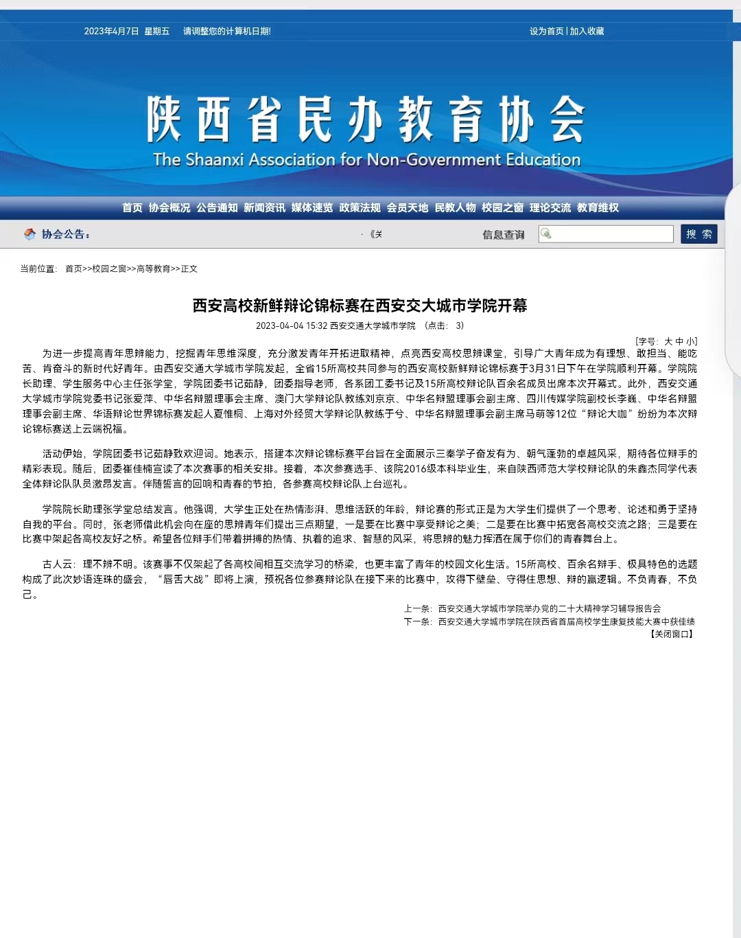 近日,陕西省民办教育协会报道了学院举办的西安高校新鲜辩论锦标赛情况。