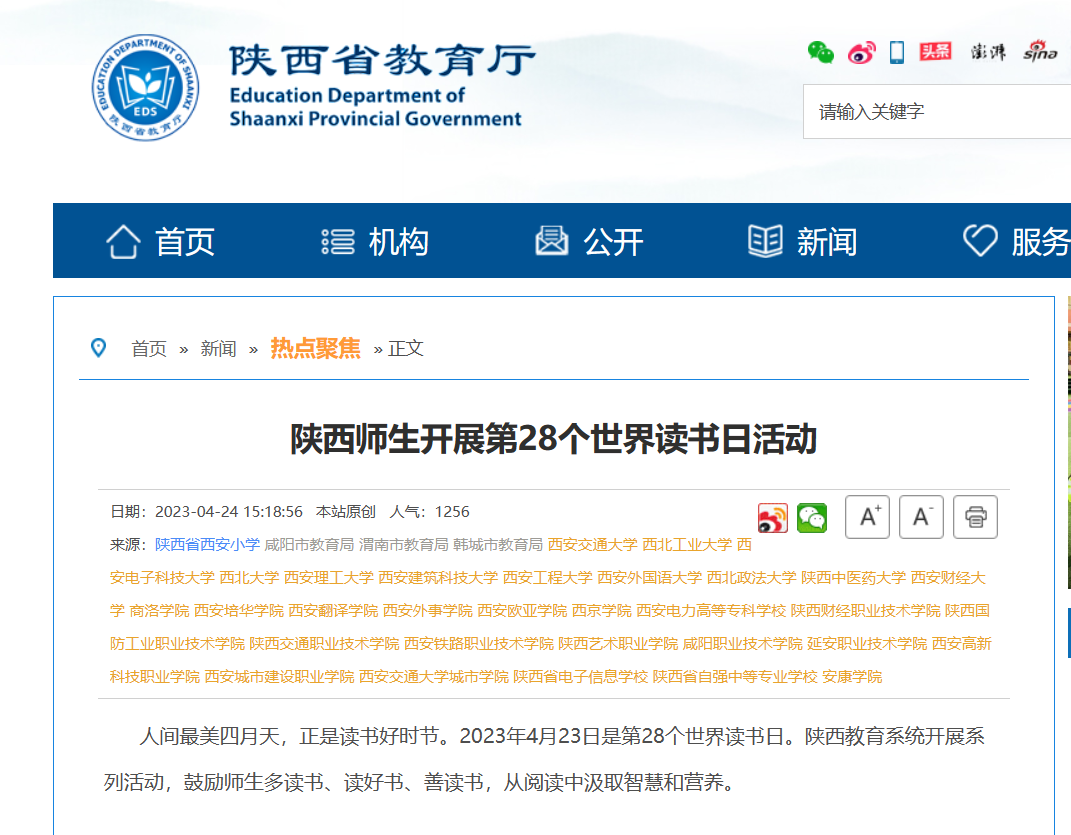 4月24日,陕西省教育厅报道了学院开展第28个世界读书日系列活动的情况。内容如下: