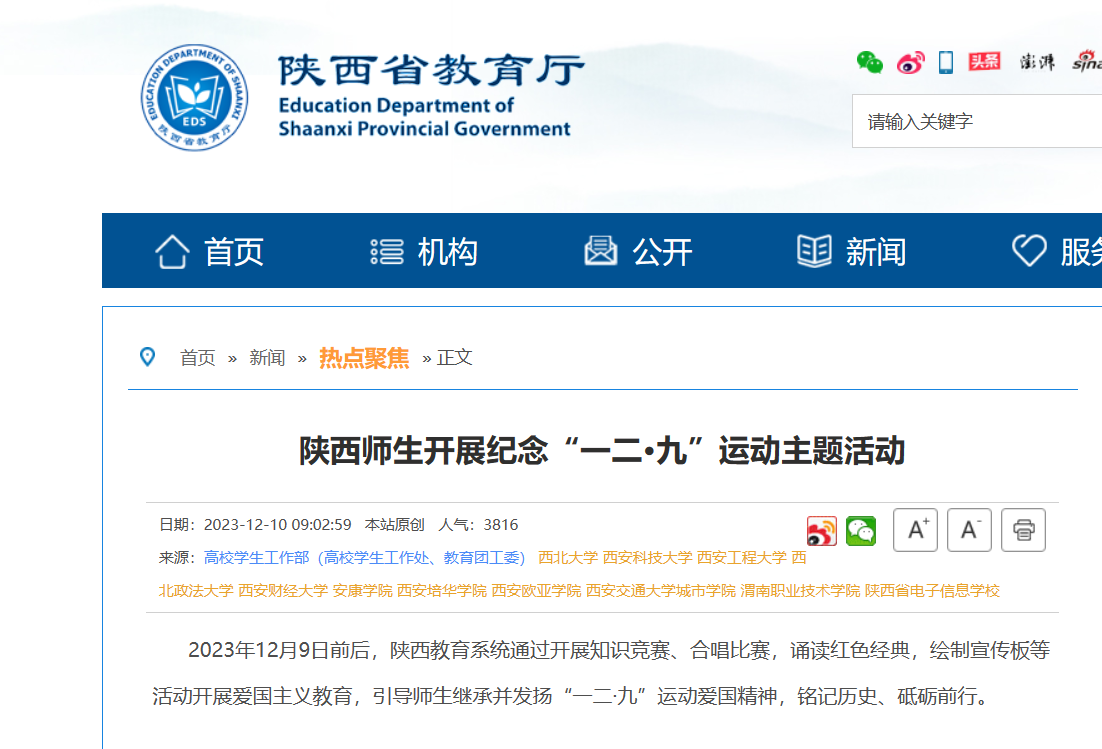 近日,陕西省教育厅报道了我校纪念“一二·九”运动主题活动,具体内容和链接如下: