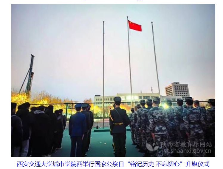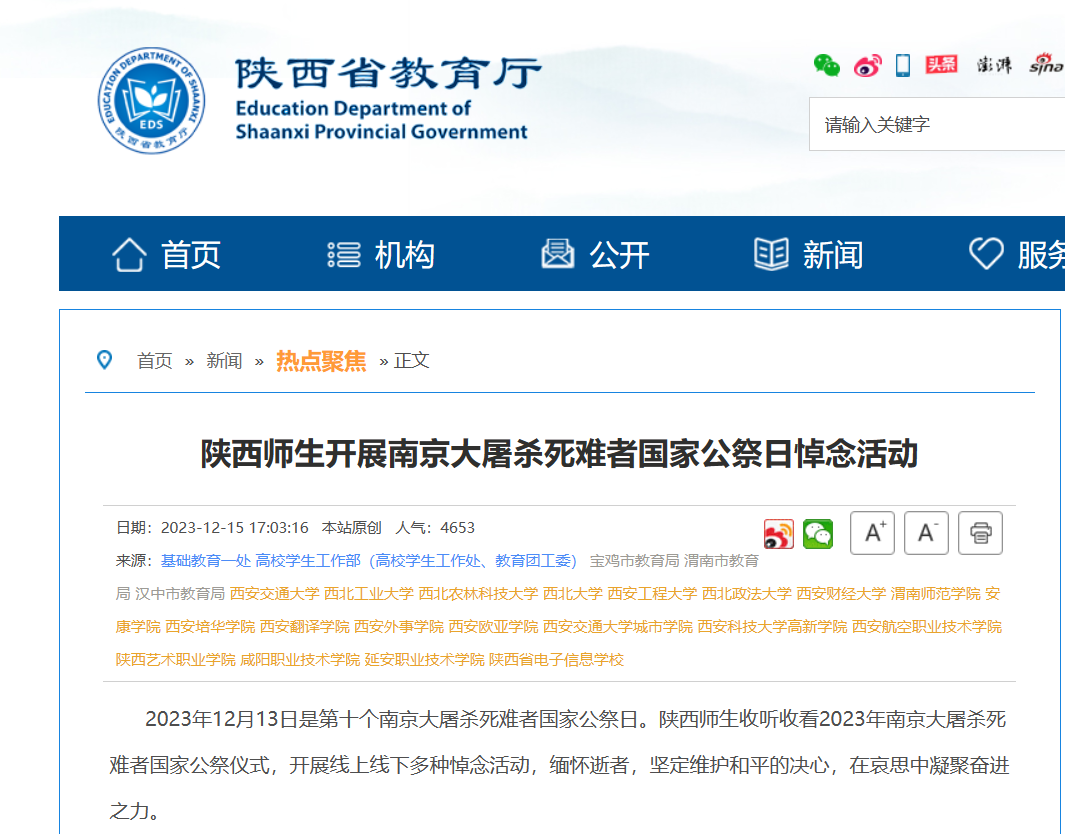 近日,陕西省教育厅报道了学校师生开展南京大屠杀死难者国家公祭日悼念活动,具体内容及链接如下: