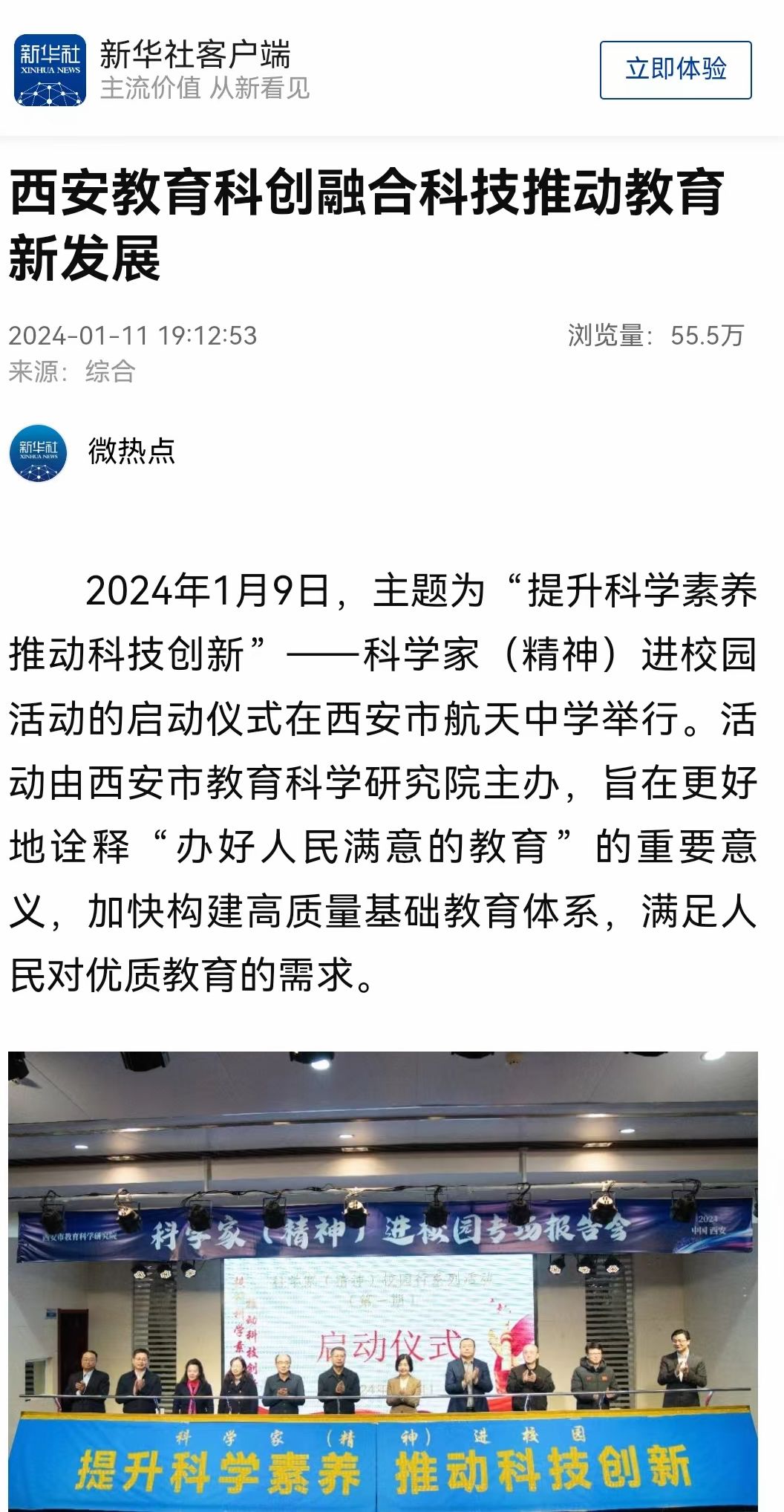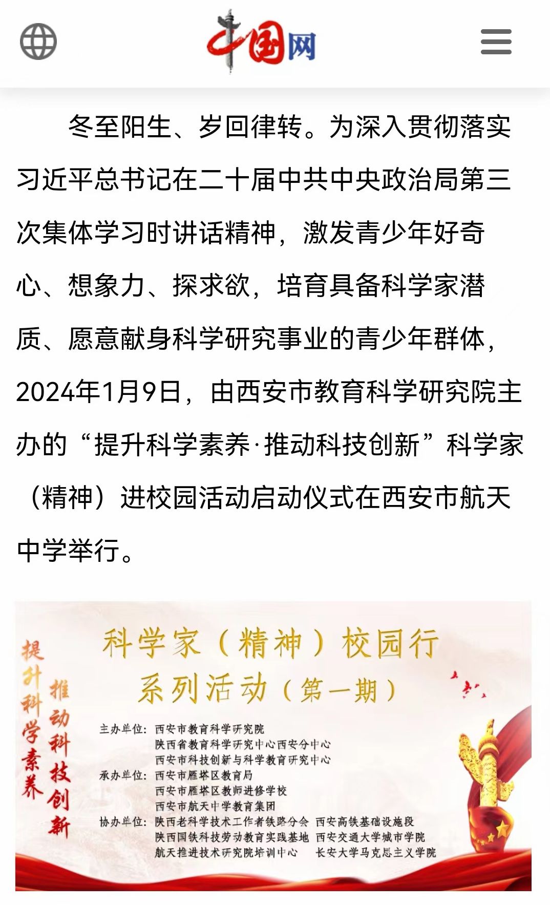 1月9日,由西安市教育科学研究院主办的“提升科学素养·推动科技创新”科学家(精神)进校园活动启动仪式在西安市航天中学举行,我校学生处副处长、团委书记茹静,机械工程学院院长助理王丽丽、团工委书记高荣、实验室教师刘云韬和团委指导老师金牧羊作为协办单位代表出席本次活动。