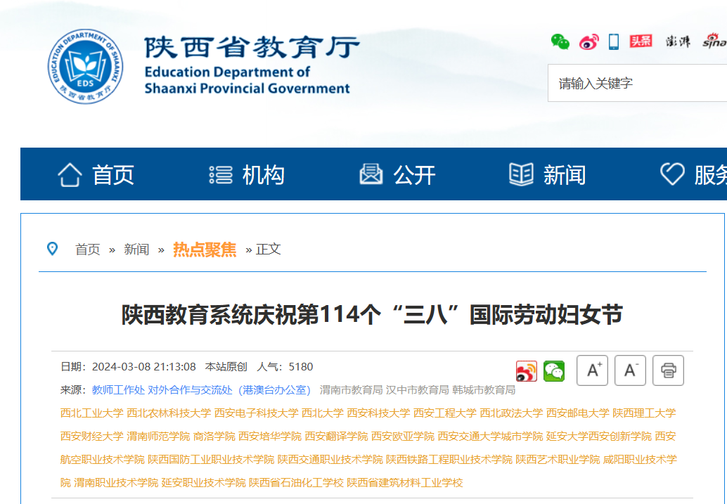 近日,陕西省教育厅对学院庆祝国际劳动妇女节进行了报道,具体链接如下: