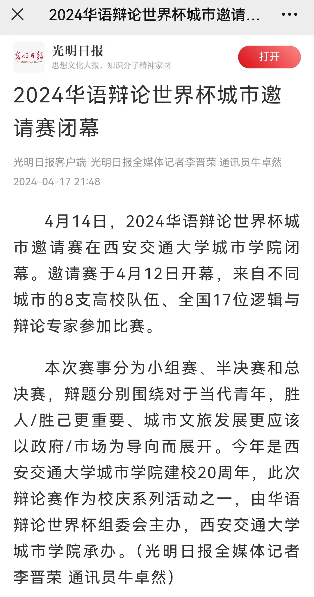 4月14日,2024华语辩论世界杯城市邀请赛在yl7703永利官网闭幕。邀请赛于4月12日开幕,来自不同城市的8支高校队伍、全国17位逻辑与辩论专家参加比赛。