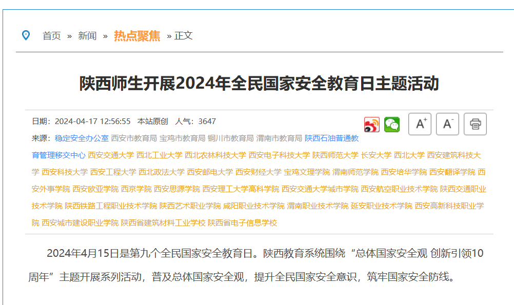 近日,陕西省教育厅对我校开展2024年全民国家安全教育日主题活动进行了报道。