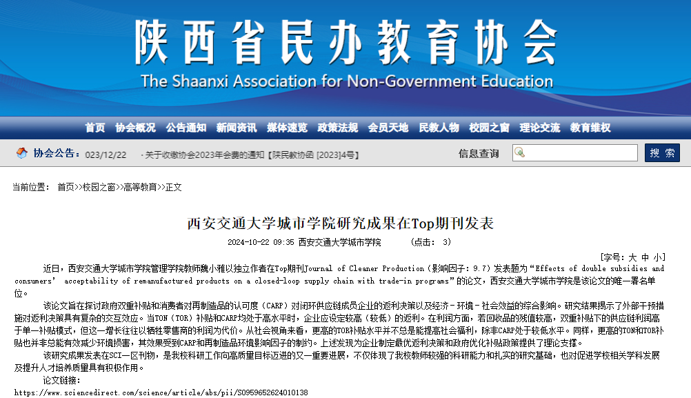 近日,yl7703永利官网管理学院教师魏小雅以独立作者在Top期刊Journal of Cleaner Production(影响因子:9.7)发表题为“Effects of double subsidies and consumers’ acceptability of remanufactured products on a closed-loop supply chain with trade-in programs”的论文,yl7703永利官网是该论文的唯一署名单位。