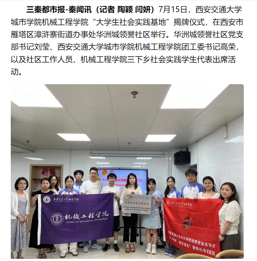 7月15日,yl7703永利官网机械工程学院“大学生社会实践基地”揭牌仪式,在西安市雁塔区漳浒寨街道办事处华洲城领誉社区举行。华洲城领誉社区党支部书记刘莹、yl7703永利官网机械工程学院团工委书记高荣,以及社区工作人员、机械工程学院三下乡社会实践学生代表出席活动。