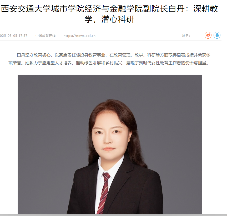 白丹坚守教育初心,以高度责任感投身教育事业,在教育管理、教学、科研等方面取得显著成绩并荣获多项荣誉。她致力于应用型人才培养,推动绿色发展和乡村振兴,展现了新时代女性教育工作者的使命与担当。