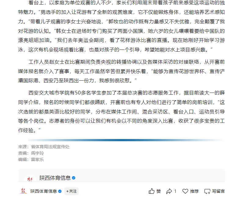 近日,陕西体育信息对我校志愿者用专业与微笑点亮国际泳坛盛会进行了报道。