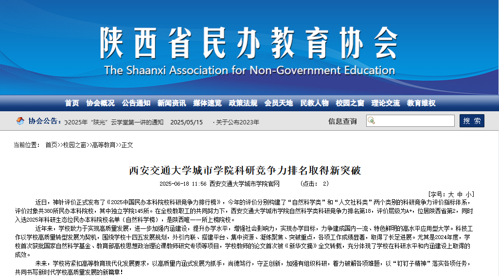 近日,陕西省民办教育协会对我校科研竞争力排名取得新突破进行了报道。