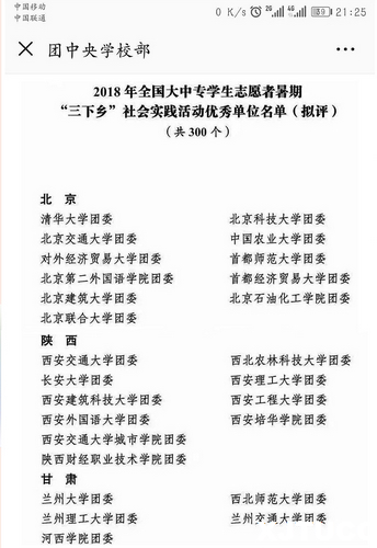在由团省委举办的2018年陕西大中专学生“三下乡”社会实践活动评选中,我院“三下乡”活动成果最终被团省委评为“省级示范学校”、2018年全国大中专学生志愿者暑期“三下乡”社会实践活动优秀单位。我院青年志愿者协会初晨队、羽翼队,支农促进会朝阳队被评定为“省级优秀团队”、我院尹洋洋、曹妍同学被评为省级先进个人。