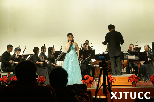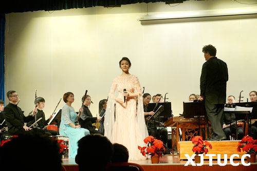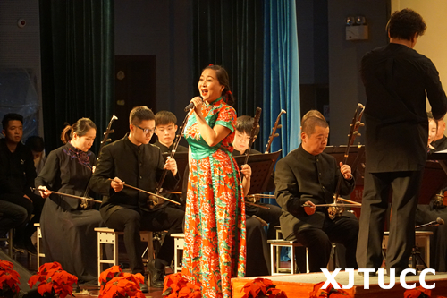 赵季平先生的作品《庆典序曲》的演奏为音乐会拉开了帷幕,那动听的乐器齐鸣,令人陶醉。青年歌唱家纪小燕为我们演唱歌曲《山丹丹开花红艳艳》《女儿歌》,那犹如天籁的女高音,调动了现场的氛围。接下来刘欣老师独奏《秦腔牌子曲》,乐曲时而豪气冲天,时而宛若丝缕,时而欢快跳跃,时而悲泣低吟,声声入耳,丝丝沁脾。张璐老师为我们带来歌曲《远情》《妹妹找哥泪花流》,其深邃优美的歌词,再加上传统民乐特色以及新的唱法带给观众无限的回味和感叹。毋帅云老师、毋帅博老师带来的《百鸟朝凤》唢呐二重奏,让人回味无穷。民族管弦乐《射雕英雄传》既有江湖豪情,又有忧国忧民挂心间,让听众心潮澎湃。范婕老师、张翼老师带来的二胡与大提琴中外不同特色乐器合奏《菊花台》,让我们感受到中外文化交流与碰撞是如此的和谐与温情。张瑜磊老师的歌曲《向天再借五百年》《敢问路在何方》让现场的观众热血沸腾,同时也向我们展现了男高音的魅力。王月老师带来的竹笛《秦川情》给我们带来了清新淡雅的音乐美感。刘梅老师的一曲《梨花颂》更是让同学们震撼不已,同时又阵阵忧伤,些许凄凉。民族管弦乐《加勒比海盗》更是把中外音乐元素融合到了一起,沁人心肺让人陶醉。