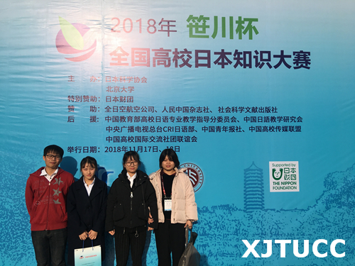 由北京大学和日本科学协会共同主办、日本财团特别赞助的2018年“笹川杯”全国高校日本知识大赛,于11月17日至18日在北京大学英杰交流中心举办。来自全国109所大学的400余名师生参与了此次大赛。西安交大城市学院外语系日语151班黄嘉乐、王琼同学和日语161班张佳琳同学参赛并获得优秀团体奖、优秀个人奖,陈昕老师获得优秀指导老师奖。