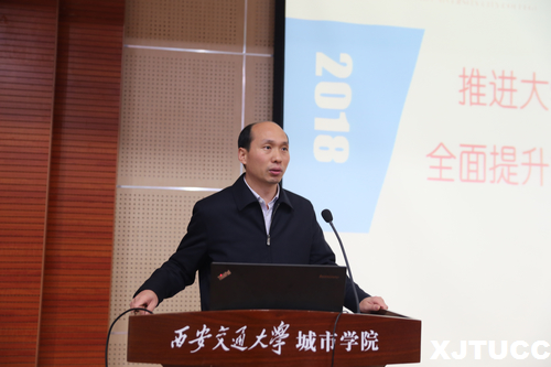 韩红建院长助理结合新时代高等教育变革这一全新背景,就如何推进大学英语教学改革,全面提升大学英语教学质量作了重要讲话。他指出,学院教学改革工作要认真贯彻《新时代全国高等学校本科教育工作》会议精神要求,坚持“以本为本”,推进“四个回归”,明确大学英语教学改革思路与目标,加强组织领导,建立联动机制,全院一盘棋,保证内涵提升和改革成效。