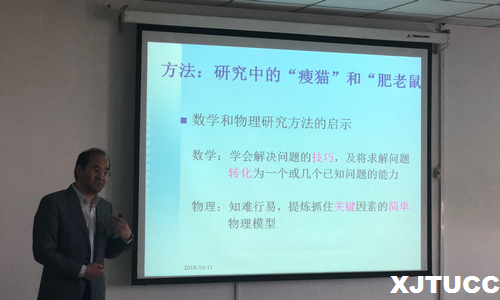 会议伊始,吴九汇教授对参加本次讲座的各位老师表示感谢。随后,吴教授从科学研究的方法、方向、意义等五个方面介绍了本次会议的内容。他表示,在研究中,选题时要弄清研究中的“树干”和“树枝”,掌握找到“瘦猫”和“肥老鼠”的方法,并举出了许多详细的科学研究事例来阐述“他山之石,可以攻玉”的理念。最后,吴九汇教授就如何利用数学和物理的方法、科学与工程的关系、研究中的自信以及如何申请基金项目等内容为我院老师做了详细总结。