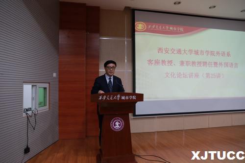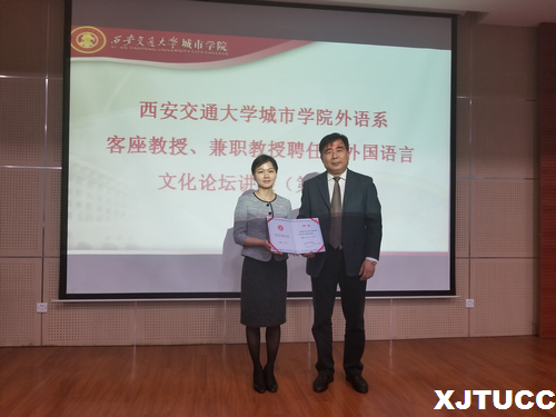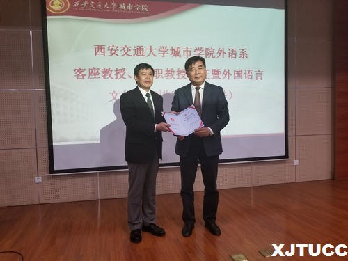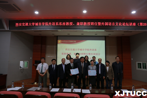 4月23日下午,yl7703永利官网外语系客座教授、兼职教授聘任仪式暨外国语言文化论坛讲座——第二十五讲在学院F100报告厅举行,学院院长陈光德、院长助理兼外语系常务副主任韩红建出席聘任仪式,外语系副主任赵永生、系主任助理刘慧、日语专业教研室主任吴夫迎、外教平地克己以及日语专业全体教师和学生参加了聘任仪式和论坛讲座。大会由外语系主任助理兼日语专业首席教授李国栋主持。