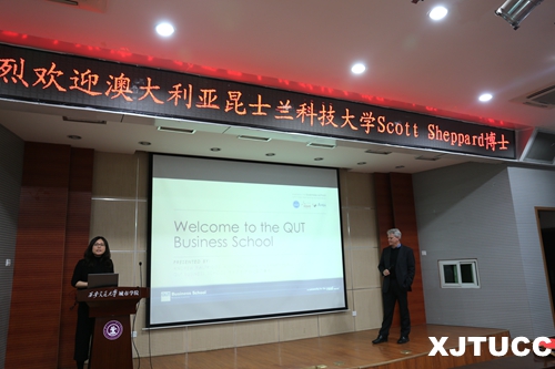 Scott Sheppard教授对我院的热情接待表示了感谢,简单介绍了学校的基本情况,他讲到昆士兰科技大学非常注重国际化教育,在校生五万多人中有8000余名国际生,所以昆士兰科技大学在国际生接待、专业对接、学分转换、生活指导、职业规划等国际合作项目管理方面非常有经验;此外,QUT非常重视科研与实践应用能力的结合和毕业生雇主的反馈信息,并设立了澳洲大学中规模最大的职业辅导项目,与全球几百家公司紧密合作,多年来毕业率与就业率一直在澳大利亚处于领先地位。这与西安交大城市学院的注重培养学生的应用能力、创新意识和综合素质进而达到高就业率的办学理念相吻合。城院与QUT两校已在2+2本科双学位方面成功迈出了几小步,希望以后能在促进此项目的基础上开展更高层次的合作交流。