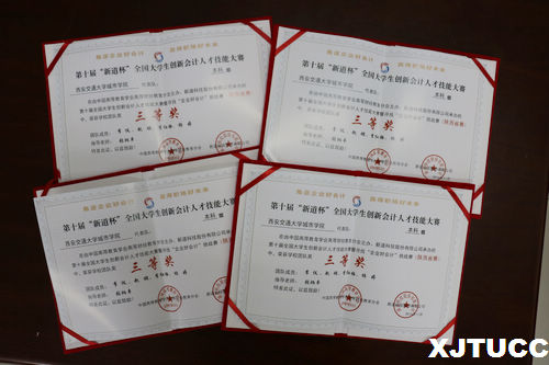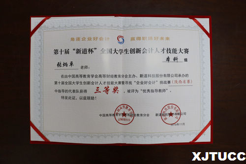 2016年11月,由陕西省高等教育学会、陕西省职业技术教育学会联合主办,西安交通大学和新道科技股份有限公司承办的第十届“新道杯”全国大学生创新会计人才技能大赛陕西省总决赛在西安交通大学举行,我院管理系组织参加了本次大赛,由会计学专业李仪、赵璇、李红梅、杨婷四位同学组成的队伍荣获大赛三等奖,张炳卓老师获得“优秀指导教师”称号。