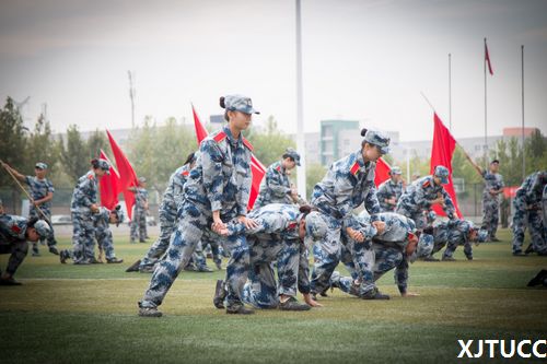 上午9时,军训总结表彰大会在庄严肃穆的升国旗仪式中开幕。迎团旗仪式后,学院院长陈光德在白鹿原学生军训基地主任田宏远大校和军训团参谋长张乾坤的陪同下,检阅了受阅方队。“同学们辛苦了”,“为人民服务”等铿锵有力的回答在操场上此起彼伏、久久回荡。随后,19个方阵以嘹亮的口号、昂扬的精神、整齐的队列,依次从主席台前经过。军训汇报表演在快乐舞步调适操中开始,女兵们用舞蹈演绎了军营生活的丰富多彩,刚柔并济、跌宕起伏,展现了巾帼不让须眉的豪情气概;男子擒敌拳场面宏大、震撼人心,彰显出军旅男儿的英雄本色;女兵摔擒展示摔、打、擒、砸、快速制服对手的动作技巧,舒展有力,变化灵活;解救人质表演中学员们在教官的指导下完成了匍匐前进、瞄准、作战队形变换等一系列动作,将学习到战术知识有效应运到演习中;女子花样表演女兵们通过变换队形、手势,相继摆出了“中国梦”、“奥运五环”、“建党95周年”、“帆船”、“9月10日老师辛苦了!”等寓意深刻的队形,向我们展现着她们的军训成果,表达了2016级城院学子心中责任、敢于担当、懂得感恩的精神风貌,她们的表演赢得了现场阵阵掌声。