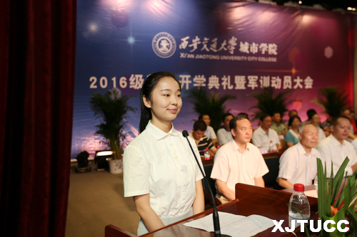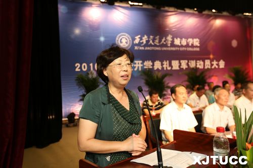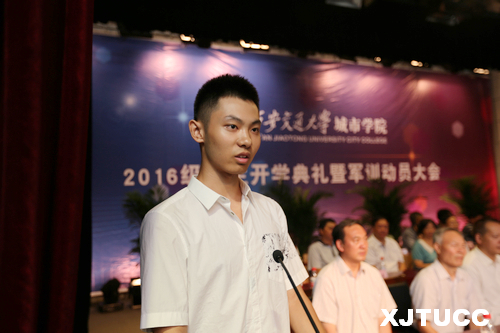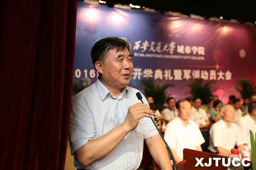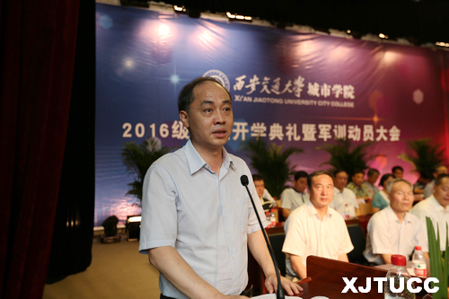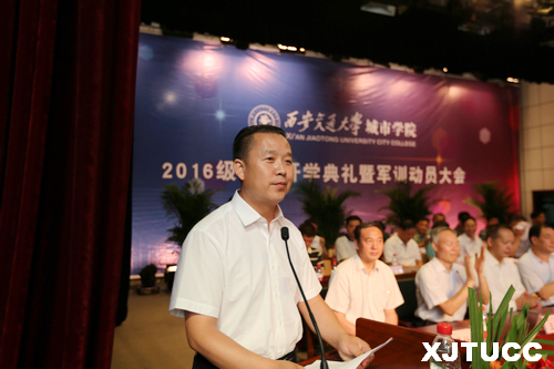 西安交通大学荣命哲副校长在讲话指出,城市学院传承了西安交通大学的优良办学传统,坚持严格的教学管理、优良的教学组织、严谨的教学风格,以提高教学质量为核心,在人才培养方案和教育教学模式上逐渐形成特色,在社会上树立起了良好的形象与品牌。他希望大家趁年轻多读书,读好书,读活书,德、智、体全面发展,并锻炼好自己的身体,提高自己的修养及素质;希望大家志存高远,以认真勤奋的态度,执著求索的精神,甘于寂寞,圆满完成大学学业,成为一名合格的公民和高素质的大学毕业生,为国家和民族振兴做出自己最大的贡献;同时,也希望大家在接下来的军训生活中,磨练意志,培养吃苦精神,增强团队意识和组织纪律性,圆满完成军训任务,以实际行动上好进入大学的第一课。