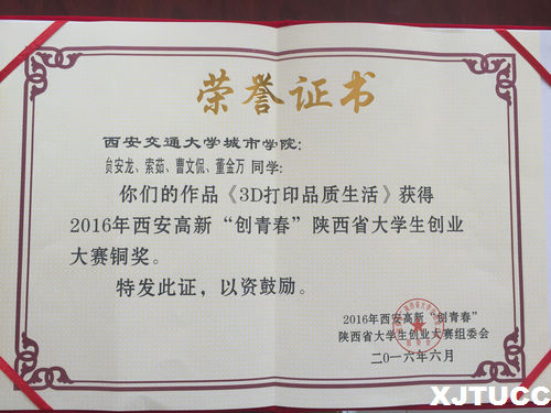 本次大赛共收到43所高校的552余件作品,内容涉及机械与控制、信息技术、数理、生命科学、能源化工、人文社会科学等多个领域。竞赛组委会组织了由省内经济、金融、风险投资专家和企业家组成的评审委员会通过书面评审和秘密答辩相结合的方式对作品进行了评审,经过角逐,共产生62件金奖作品、94件银奖作品、127件铜奖作品。其中我院学生丁盼、郭浩、钟永峰同学的作品《筑梦公益发展中心》获得金奖,并被大赛组委会推荐参加2016“创青春”全国大学生创业大赛(陕西省独立学院唯一一支代表队,是我院在此项比赛中的历史性突破);翟峰、李磊、朱攀宇、弥阳、楚敏、曾蓉蓉等同学的作品《由你》,李广宇、蒋韧、杨帅同学的作品《COMS映象》,贠安龙、索茹、曹文侃、董万金同学的作品《3D打印品质生活》获得铜奖。