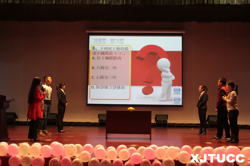 比赛共有10支学生队和2个教师队参赛。比赛正式开始后,首先由学生队进行三轮答题。选手们一路披荆斩棘,通过了重重考验,最终角逐出学生组一二三名。教师组的比赛也是异常激烈,每位参赛的老师都全力以赴。最终由学生组的冠军队与教师组的冠军队两队pk进行了一场精彩的表演赛。比赛期间与会人员还欣赏了由护理系大一新生带来的手语节目“我们都一样”以及吉他民谣表演。