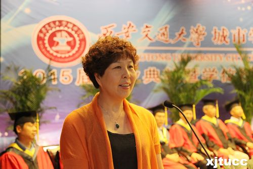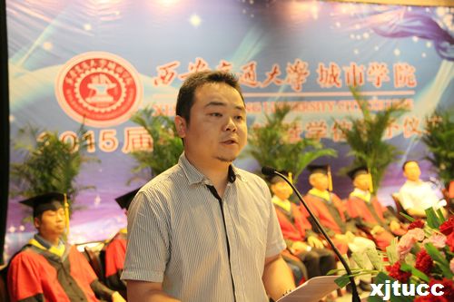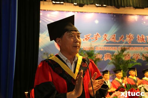西安交通大学副校长郑庆华教授向毕业生寄语。郑校长指出要成为社会的有用之才,国家的栋梁之才,还有很多艰辛的道路需要探索。他认为真正的人才除了具备扎实丰富的基础知识外,还要具备三个核心素质,即坚实的能力、不断进取的创新思维以及崇高的思想境界。他希望同学们心怀远大的抱负,直面人生的挑战,勇担时代所赋予的历史使命和社会责任,为国家、社会、母校做出新的贡献,为实现伟大的“中国梦”付出自己的努力。讲话结束之际,郑校长用“以参与赢得机会、以奉献求得发展,以贡献赢得回报,以作为赢得地位”四句话来勉励毕业生们,并祝福同学们在未来取得更大的成绩。