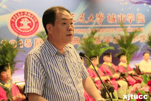 院长陈光德发表了热情洋溢的讲话,他对全体毕业生提出了殷切希望,希望大家“坚定自信,心怀梦想,追求卓越”、“脚踏实地,勤学不止,与时俱进”、“始终保持身心健康,敢于担当责任和直面挑战”、“情系母校、关注母校,常回来看看”。陈院长说,不管毕业生身处何方,从事任何工作,母校都期望大家能够在自己的工作岗位上成就一番事业!母校将一如既往地关心、关注和支持你们,交大城市学院将永远是你们的坚强后盾和精神家园。希望大家离开母校后,也继续关注母校的建设和发展,与学院一起,为将学院建设成“国内一流,国际知名”的高水平应用型大学而共同携手前行。在毕业生即将开启新的人生征途之际,陈院长衷心地祝福2015届的同学们前程似锦,事业有成。祝愿每一位同学都拥有一个幸福美好的人生!