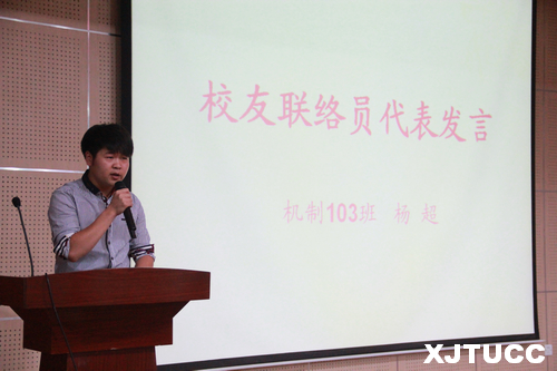 机制103班杨超同学作为校友联络员代表进行发言,号召校友联络员树立服务母校、校友的意识,认真履行校友联络员的职责,搭建好校友与校友、校友与母校之间的桥梁,在新的工作岗位上创造出更优异的工作业绩,回报母校,回馈社会。最后,杨超祝福母校越办越辉煌,并给老师、校友及学弟学妹们送出了美好的祝福。
