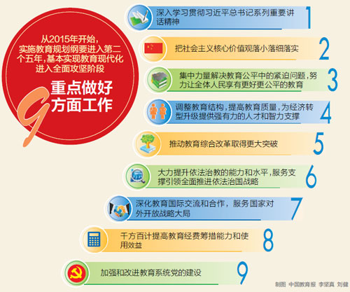 袁贵仁强调,从2015年开始,实施教育规划纲要进入第二个五年,基本实现教育现代化进入全面攻坚阶段。要重点做好9方面工作。一是深入学习贯彻习近平总书记系列重要讲话精神。要深化学习内容,联系教育实际,确保扎实有效,把教育系统广大师生员工的思想和行动统一到中国特色社会主义伟大事业上来。二是把社会主义核心价值观落小落细落实。要落实到教材课堂头脑中、文化育人中、实践活动中、政策制度中,培养具有坚定理想信念的社会主义建设者和接班人。三是集中力量解决教育公平中的紧迫问题,努力让全体人民享有更好更公平的教育。要加快缩小城乡差距、区域差距、校际差距,提高困难群体教育保障水平。四是调整教育结构,提高教育质量,为经济转型升级提供强有力的人才和智力支撑。要加快发展现代职业教育,推动地方本科高校转型发展,加快一流大学和一流学科建设,加快发展继续教育。五是推动教育综合改革取得更大突破。要深入推进省级政府和高等学校教育综合改革、考试招生制度改革、人才培养模式改革、办学体制改革,深入推进管办评分离,确保中央全面深化改革的任务要求落实到位。六是大力提升依法治教的能力和水平,服务支撑引领全面推进依法治国战略。要依法行政、依法办学、依法执教,加强法治教育,创新法治人才培养机制。七是深化教育国际交流和合作,服务国家对外开放战略大局。要做好出国留学工作,加大来华留学工作力度,提高中外合作办学质量,加强国家开放战略需要的人才培养和科学研究。八是千方百计提高教育经费筹措能力和使用效益。要坚持教育优先发展战略,坚持教育投入依法增长,提高经费使用效益,确保资金使用安全规范。九是加强和改进教育系统党的建设。对意识形态、反腐倡廉、基层党建、舆论宣传、安全稳定、作风建设等工作要紧紧抓住不放松,落实中央全面从严治党的要求。