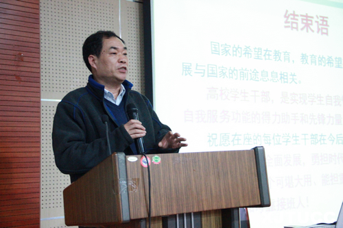 伴着庄重激昂的共产主义青年团团歌,报告会正式开始。徐永胜书记做了题为"创新奋进,追求卓越——努力争做一名优秀的学生干部"报告。徐书记就学生干部如何成长、如何做好团学工作两个方面展开阐述。他强调当代大学生要把握时代脉搏,在工作中要有奋斗理念和精神追求,积极挑战自我,从而走向成长,走向成熟,实现做一名优秀的人、卓越的人的目标。徐书记指出,目标对人生有巨大的导向作用,当代大学生应首先明确人生定位,找准人生目标,在实践中锻炼,在经验中成长。就如何做好团学工作方面,他提出当代大学生应围绕青年特点、青年需求来营造积极向上的校园文化。徐书记进一步指出,应该着重培养学生干部的决策统筹能力,并高度重视新媒体在工作中的运用,努力做一位学业争先、行为争范的优秀学生干部。在报告中,徐书记将自己多年来丰富的团学工作经验和事例穿插其中,形象生动,令现场同学受益匪浅。