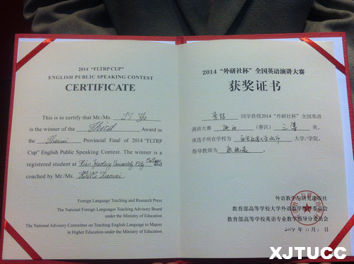 2014年"外研社杯"全国英语演讲比赛陕西赛区分赛于11月1日在西安科技大学隆重举行。经过各高校初赛选拔,全省共有44名选手参加陕西赛区比赛。西安交大城市学院电气201班的李喆同学荣获三等奖。康晓薇老师获得"指导老师三等奖"。