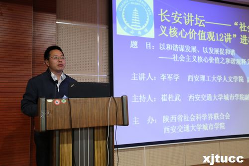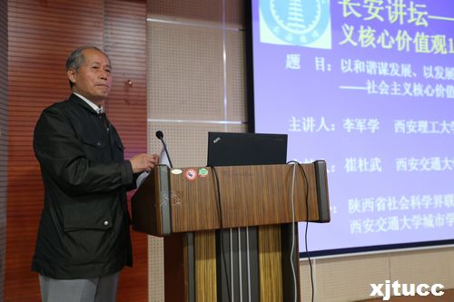 10月22日下午,由陕西省社会科学界联合会主办,yl7703永利官网承办的“长安讲坛---社会主义核心价值观12讲”活动,在yl7703永利官网F100报告厅成功举办。此次讲座特邀西安理工大学人文学院李军学副教授主讲,院长陈光德、党委书记冯民柱、副院长崔杜武、副院长张敬朝、副院长李加玉、院长助理徐君陶、工会主席王海民、各系(室)相关负责人及学生代表180余人参加讲座,讲座由副院长崔杜武主持。