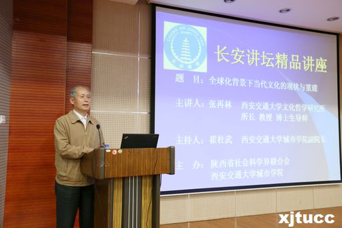 张再林教授以“全球化背景下当代文化的现状与重建”为题,共分四部分进行讲解:第一部分是全球化及其对人类文化的影响、第二部分解读中西文化差异、大三部分重点阐述了我国文化的历史渊源,最后探讨了我国文化的走向问题。张教授的讲座将理论与现实紧密结合,具体生动,使与会师生对当代文化加深了认识。报告在热烈的气氛中圆满结束。
