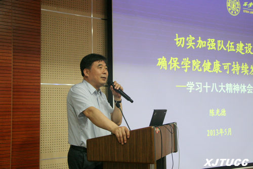2013年5月15日下午,yl7703永利官网在教学楼F100报告厅举行“十八大”精神学习交流会。yl7703永利官网院长陈光德教授以“切实加强队伍建设,确保学院健康可持续发展”为主题,畅谈了自身学习十八大精神的体会和思路。崔杜武副院长、李加玉副院长、徐君陶院长助理、学院工会王海民主席以及主管以上干部和辅导员参加了会议。赵金胜书记主持交流会。