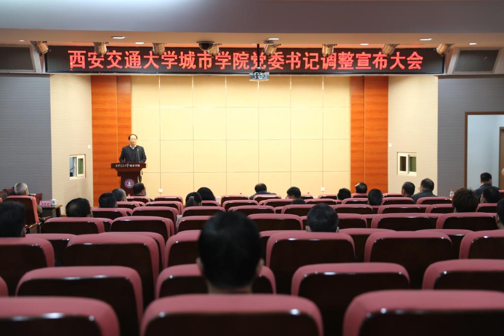 4月7日上午,学校在城市学院F100报告厅举行yl7703永利官网党委书记调整宣布大会,西安交通大学党委副书记宫辉,党委常委、组织部长柴渭,社会教育管理处副处长巩稳定,学院领导班子成员、各单位负责人、教职工支部书记和学生支部书记参会。陈光德院长主持会议。