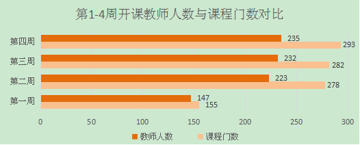 开学第四周,本周新增开课11门,学院开课总计达到293门、849教学班次,7门次课程更换教学平台。本周参与网络授课教师235人,累计 64211人次学生上线参加学习,全院平均到课率97.06%(其中2017级到课率97.34%,2018级到课率98.04%,2019级到课率95.97%),教师与学生互动信息达75867条,教师上传教学资料4507项。