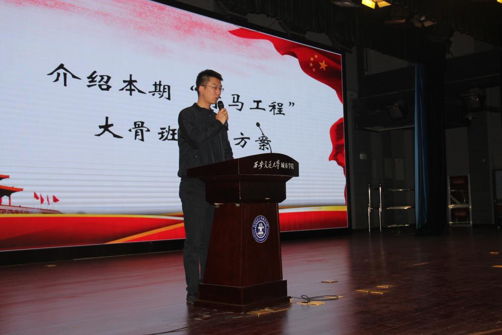 为提高大学生骨干、团学干部、青年知识分子等青年群体的思想政治素质、政策理论水平、创新能力、实践能力和组织协调能力,使他们成长为中国特色社会主义事业的合格建设者和可靠接班人,西安交大城市学院团委于11月5日中午在教二报告厅举行第十三期“青马工程”大学生骨干培训班开班典礼。出席本次典礼的领导有学院党委书记张爱萍、学生服务中心主任张学堂、团委书记吴昊翔、团委各位指导老师、各系团工委书记以及第十三期“青马工程”大骨班全体学员。本次活动由路凡同学主持。