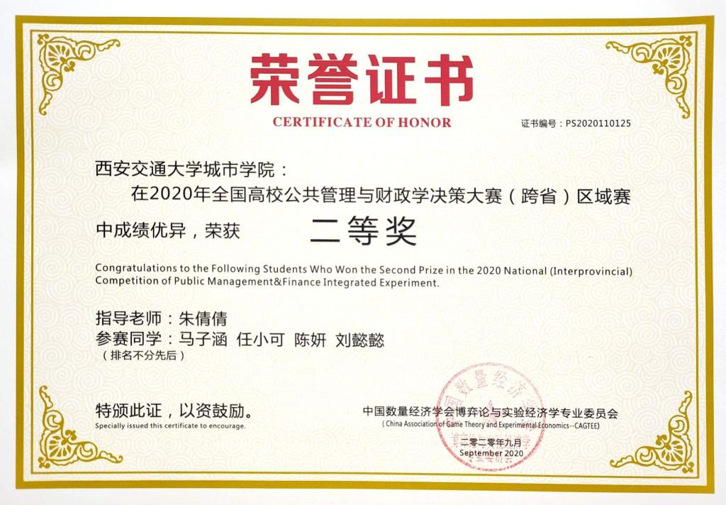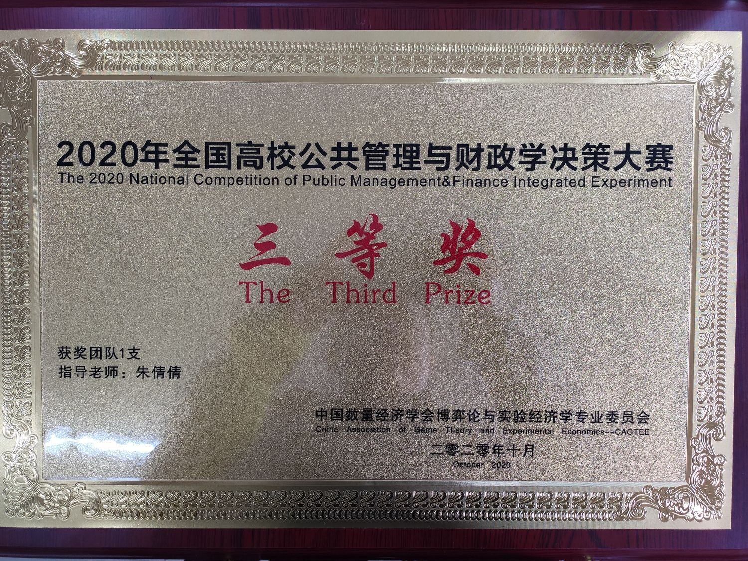 近日,由中国数量经济学会主办、安徽财经大学承办的2020年(首届)全国高校公共管理与财政学决策博弈大赛圆满落幕。yl7703永利官网代表队在经济系财政专业朱倩倩老师带领下,经过五个多月的刻苦练习,在本次比赛中荣获全国三等奖。