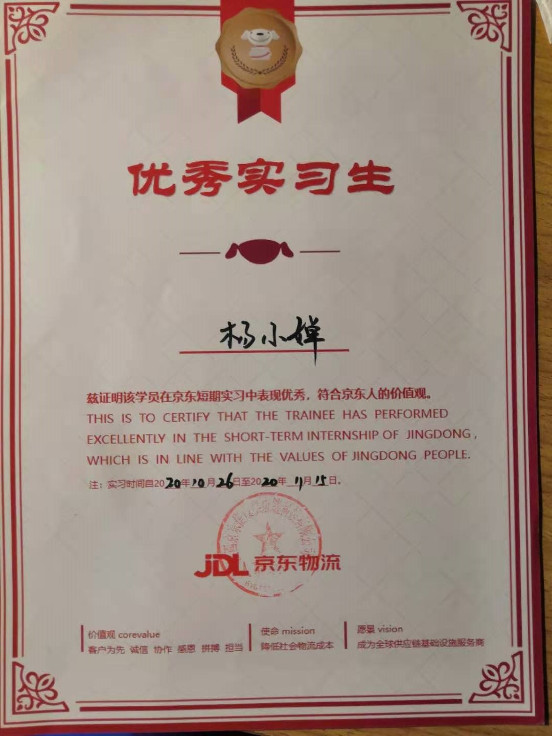 在本次集中实习中,我校学生有拼劲、有想法,认真学习、克服苦难,充分展现了我校学生的素质与能力,获得了京东西北区管理者的一致好评,在京东西北区双十一大促合作的17所院校中获得综合评价第一的优异成绩。其中,张文静、惠琛等4名同学获得京东西北区“绿色就业通道”证书,胡发彩、邱苑玲等11名同学获得“优秀实习生”称号,所有参与实习的同学均获得京东西北区“新锐之星”管培生最终面试资格,并在终极面试中,有10名同学拿到京东西北区“新锐之星”管培生的offer。