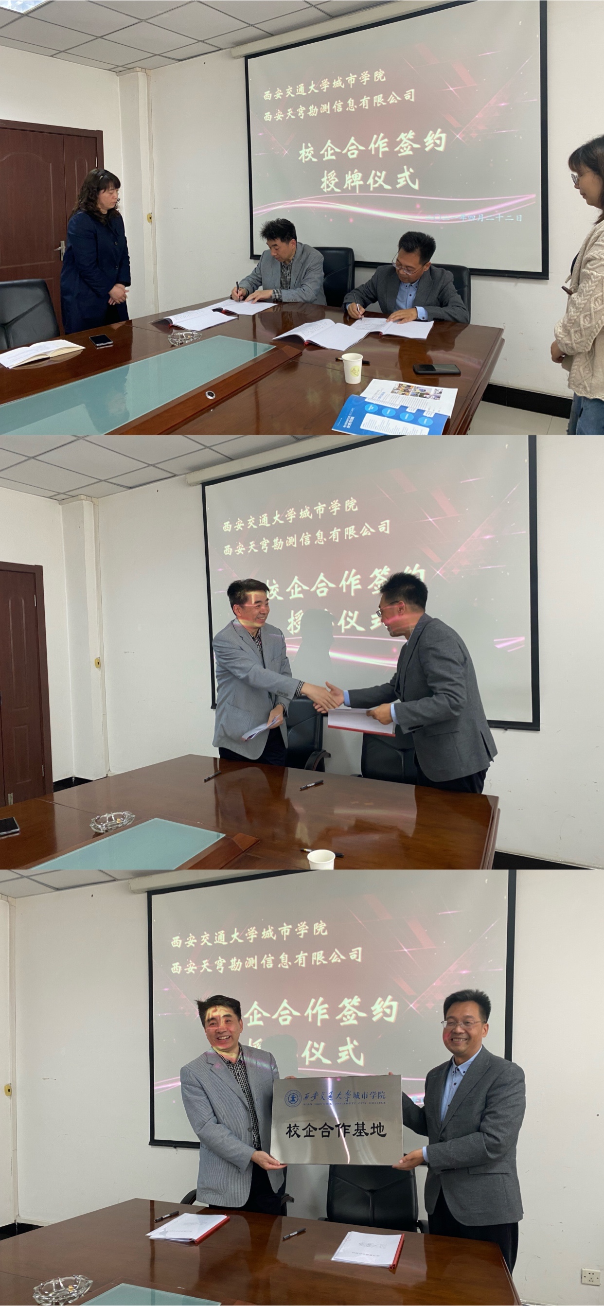 4月22日下午,西安交大城市学院土木建筑工程系与西安天穹勘测信息有限公司在行政楼508会议室举行校企合作签约及授牌仪式。西安天穹勘测公司总经理周强、测绘地信总工程师高振军、文化遗产数字中心主任李俊龙,学院副院长朱旭、综合办主任兼保卫部部长陈涛、土建系主任助理黎莹以及专业教师和学生代表参加会议,本次会议由土建系主任助理康彦青主持。