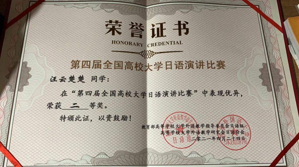 西安交大城市学院外语系商英181班汪云楚楚同学于4月24日参加第四届全国大学生日语演讲比赛决赛并获得二等奖。