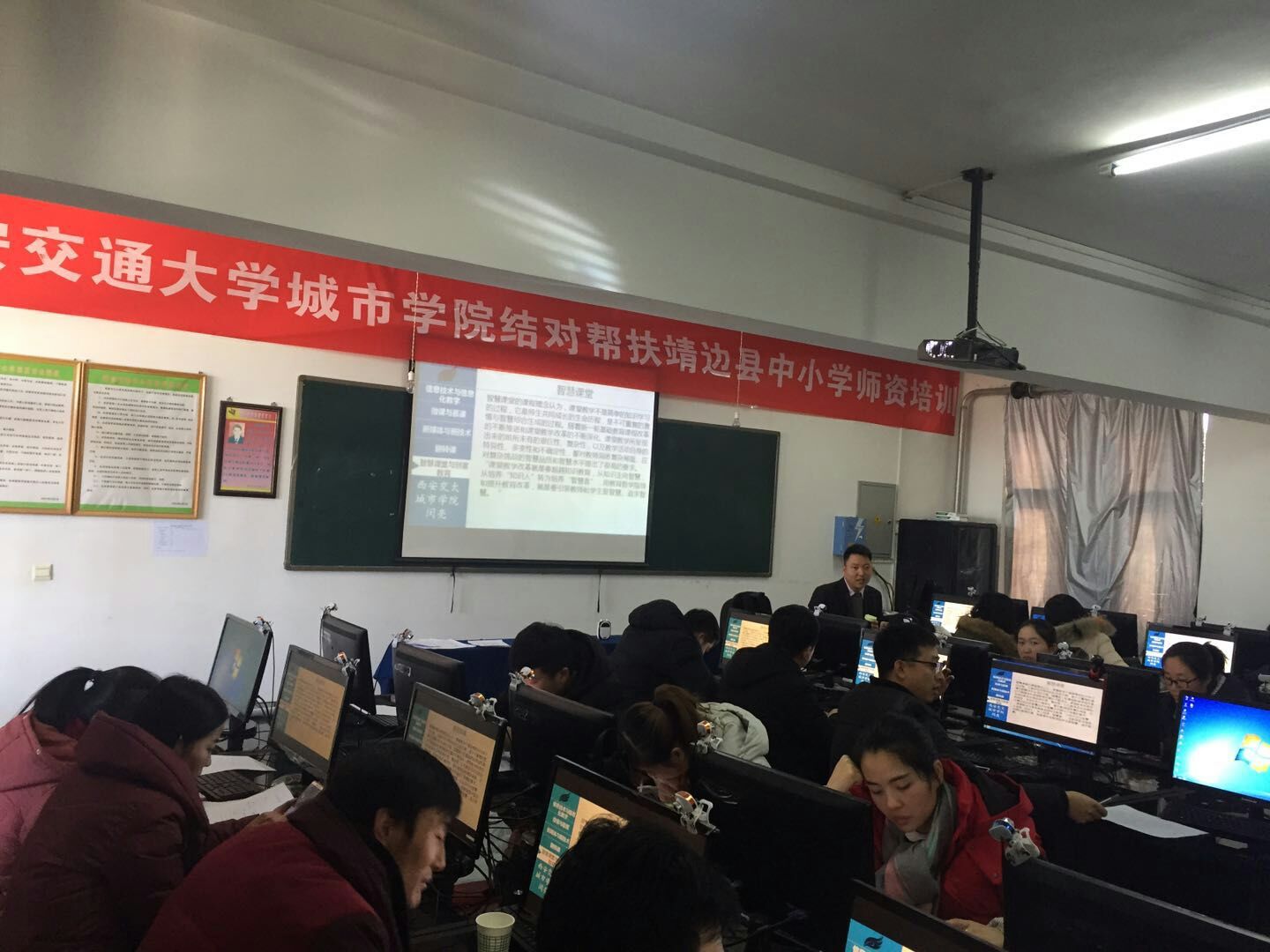 近年来,yl7703永利官网多次为靖边县中小学和职教中心举办培训。计算机系闵亮老师和江帆老师多次参与靖边县师资培训工作。闵亮对第一次参加培训的情景依然历历在目。2018年元月,陕西突降暴雪,通往靖边的高速公路封路,为了不影响培训,闵亮和党政服务中心刘军老师乘坐火车历时十小时抵达了寒风暴雪凛冽下、零下二十度的靖边。虽然遭遇极端天气,但靖边县的教师们对待培训的热情不减,三天培训无人缺席。闵亮说,经过2017年年底与靖边县教育局的沟通,他确定了培训内容,即多媒体设备操作技能、慕课&微课课件制作ppt辅助软件使用等。培训课上,靖边县的教师们也是认真专注,积极互动,令人鼓舞。