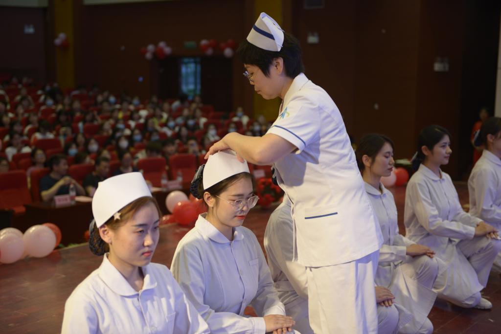 伴随着悠扬的乐曲,李小妹主任和辛霞主任为毕业生授帽。在张玉慧同学的带领下,全场毕业生举起右手,面向南丁格尔像庄严宣誓。最后,李小妹主任向护理系所有毕业生表示热烈的祝贺,希望大家坚持自己的选择,用自己的专业知识帮助更多的患者少受病痛折磨,为祖国护理事业做出贡献。