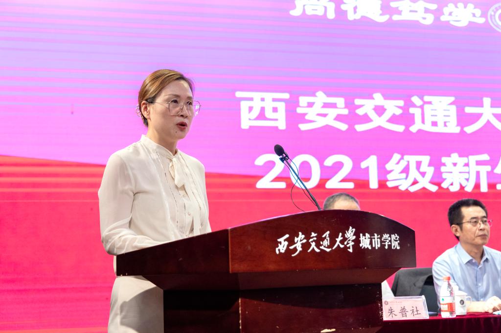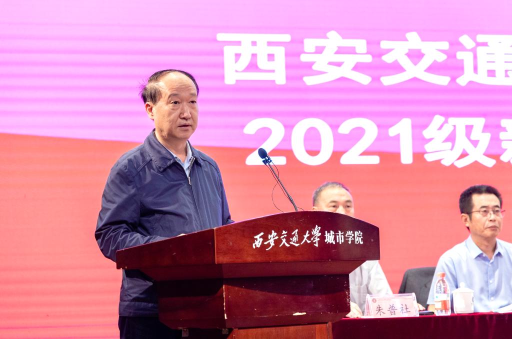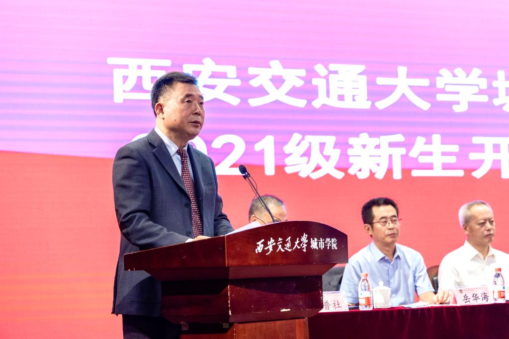 陈光德院长在讲话中代表学院全体教职员工向来自全国各地的2021级新同学表示热烈欢迎。他指出,从今天开始,同学们将步入新的人生路程,站在人生又一个崭新的起点。要思考如何能够更有意义的度过大学时光,要学会正确判断和评估事情的对与错。在获取知识的同时,要不断提升能力和素质。陈院长对大家提出了几点期望:一是希望同学们厚植家国情怀,将自己的小梦想融入新时代。希望同学们通过自己的专业学习和能力培养,将自己的梦想融入时代发展大潮,与祖国时代发展相向同行。他讲到,爱国奋斗是西迁精神的精髓,是西安交通大学的宝贵财富和优良传统,城市学院学子应该传承继承西迁精神,以习近平总书记指出的“青春因磨砺而出彩,人生因奋斗而升华”为自己前行的指引。二是希望大家树立鸿鹄之志,用短目标延展长规划。科学规划好大学生活,使每一天都过得有意义。陈院长建议同学们从今天起为自己定一个小目标,实现短期才能实现长远目标。他希望大家在大学校园找到热爱,保持求知欲、好奇心、批判精神,树立人生目标。三是希望同学们磨练坚强意志,以内宏毅驱动外行健。他希望大家尽快适应新环境,学会独立生活、自主生活与自主学习;学会独立思考和团结合作,经受住重重诱惑;学会专注学习,保持独行定力,沉住气,静下心,慎思明辨。同学们应以此次抗疫为契机,坚定意志,直面挑战,不畏惧、不放弃,以实际行动锻造优良体格。在大学期间,培养正确的人生观、价值观,在有限的生命里创造无限的价值,用美丽的青春奉献无私的大爱,在城市学院度过人生最精彩最美好的时光。