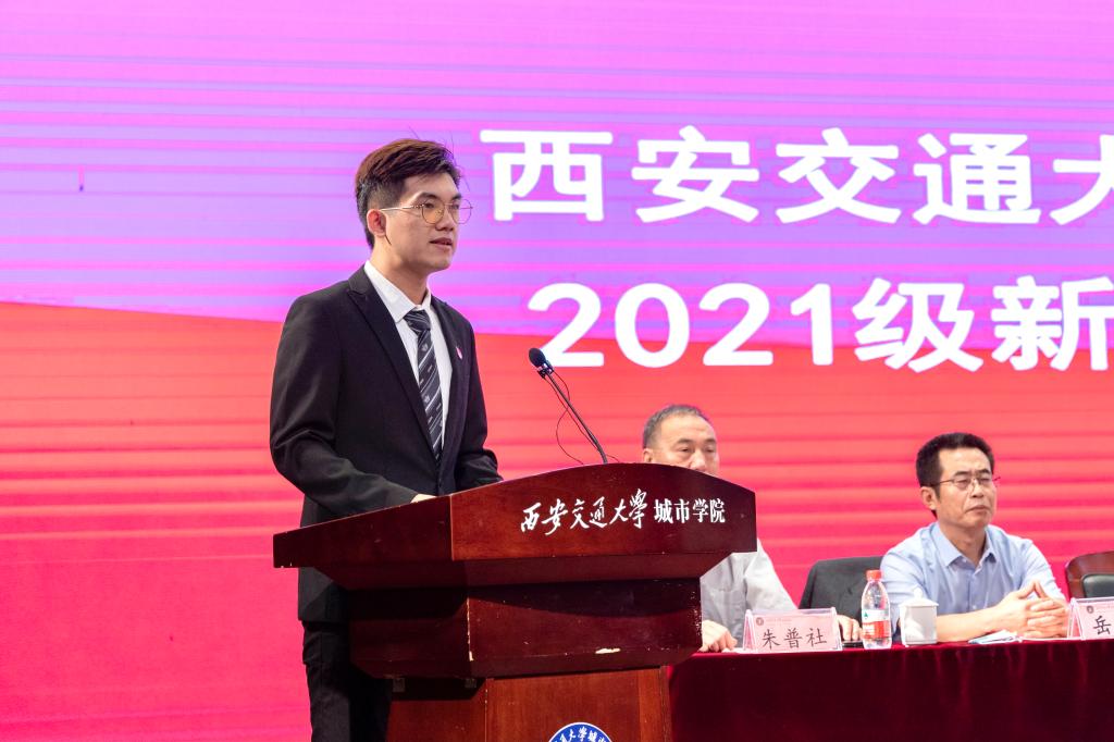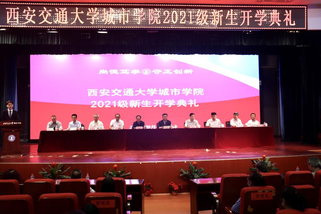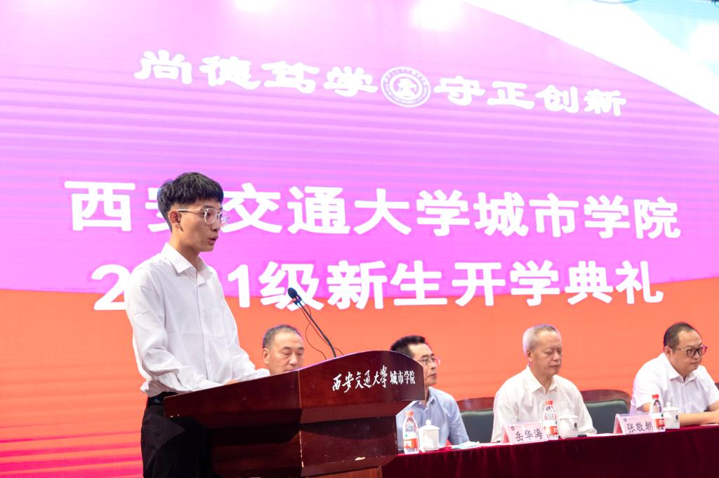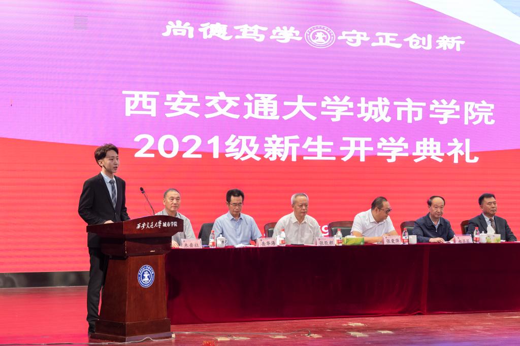 2021级新生开学典礼在庄严的奏国歌仪式后正式开始。西安交通大学党委常委、副书记赵昌昌,城市学院陈光德院长,教师代表机械工程系李莉老师,老生代表土木181班陆一洲同学,新生代表经济2101班王奕霖同学以及新生家长代表王亚丽女士分别发表了精彩的讲话。